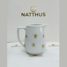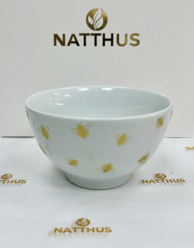 Bowl em porcelana branca com detalhes deabelhas douradas,moderno e elegante, idealpara servir frutas, cereais ou sobremesasem ocasiões especiais como o Rosh Hashaná.Medidas: 13cm de diâmetro por 7cm de altura