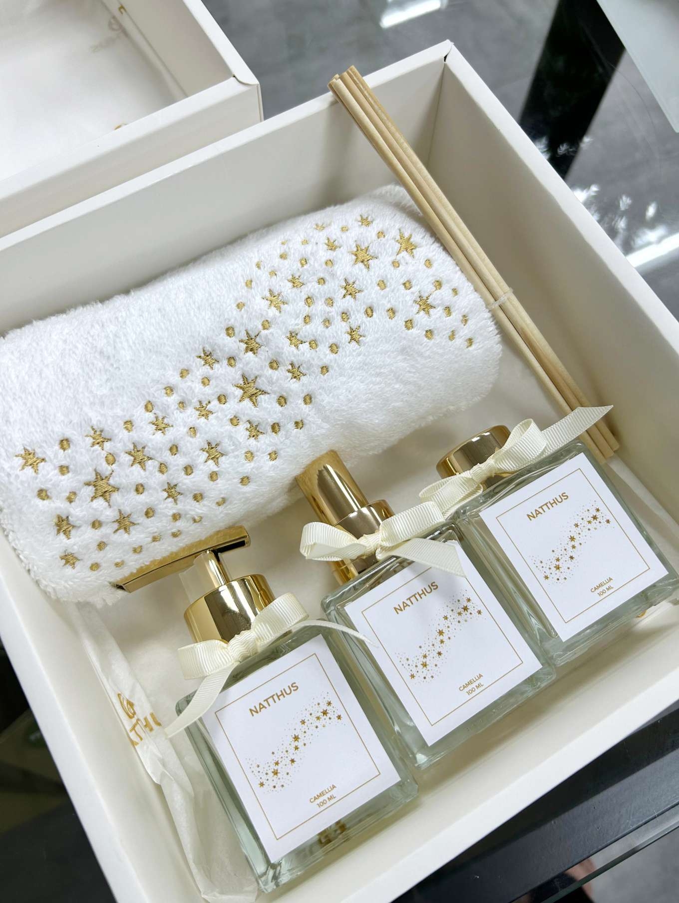 Caixa de presente sofiscada e delicada com Sabonete Líquido 100 ml + Difusor de Aromas + Home Spray 100 ml em camellia + toalha de estrelas natalinas