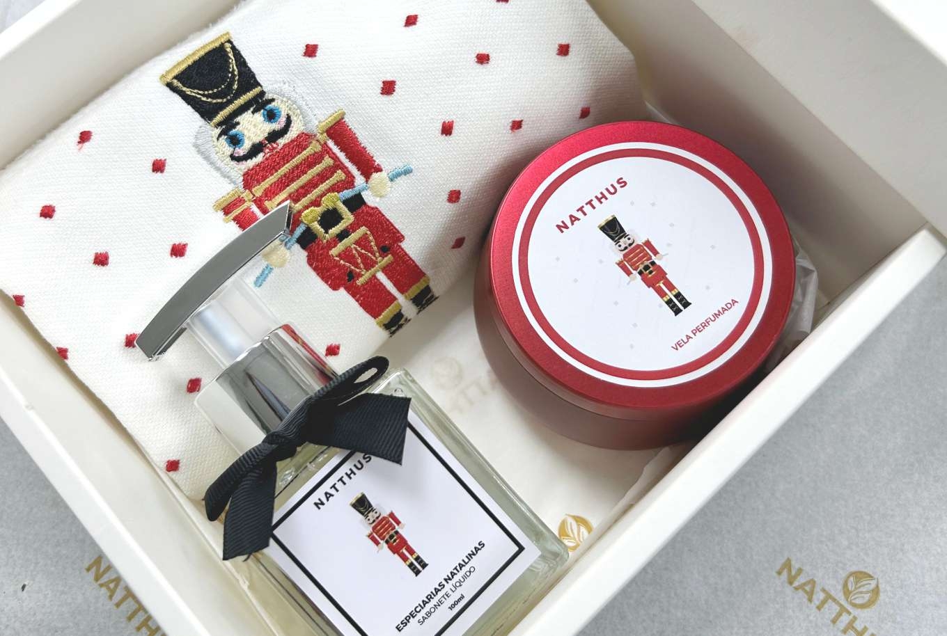 Caixa de presente super charmosa com Sabonete Líquido 100 ml + vela perfumada lata especiarias 200g + toalha do soldadinho de chumbo