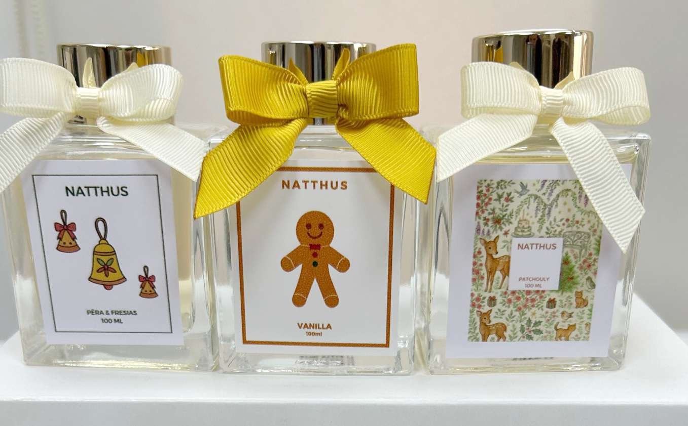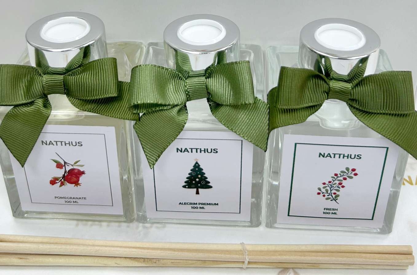 Difusores com laço, varetas em saquinho de tule e sacolinha de presente com tag de Natal, aromas: Pera & Fresias, Vanilla, Patchouly, Romãs, Alecrim ou Fresh de Capim Limão (opção Especiarias Natalinas não ilustrada).