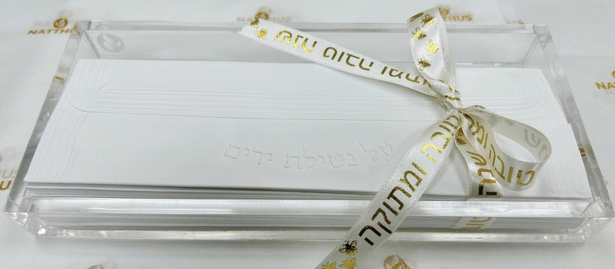 Caixa acrílica grossa tamanho 26 x 10 cm + 18 toalhas depapel premium para mãos, grafado em alto relevo “Netilat Yadaim”