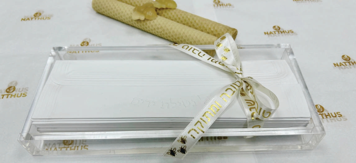 Caixa acrílica grossa tamanho 26 x 10 cm + 18 toalhas de papel premium para mão grafado em alto relevo “Netilat Yadaim” + Vela de Mel estampa de abelhas.