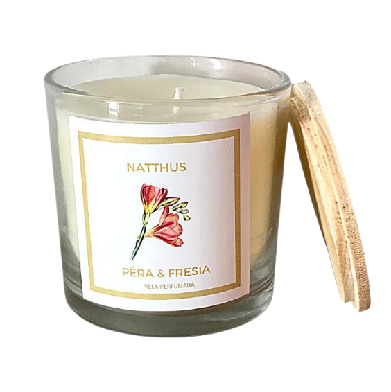 Vela em cera vegana de soja 220g em aroma sofisticado de notas adocicadas e frutais de peras com frescor floral das fresias – uma combinação chique e de presença para seus momentos especiais.
